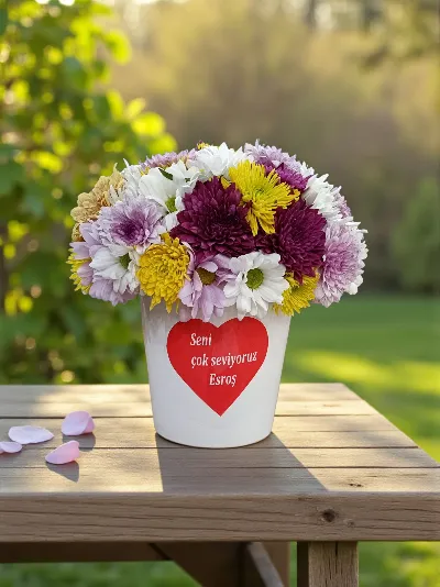 Seramik saksı içinde rengarenk arajman ve sıtıkır yazı
