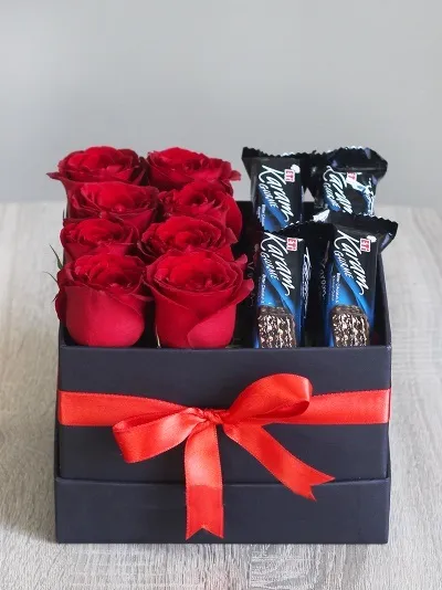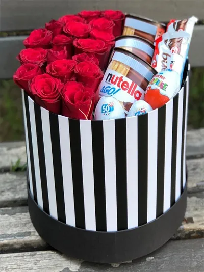 *Siyah Beyaz silindir kutu (24cm), *Ithal gul (Gul boyutuna gore 17-23 adet arasi, *3 adet Nutella Go, *3 adet Kinder Sirpriz yumurta, *2 adet Kinder Bueno