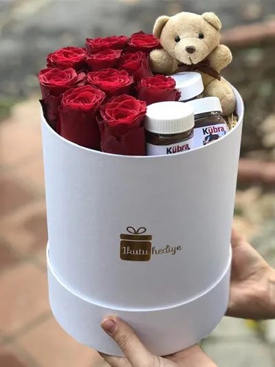 * Beyaz silindir kutu * ithal gul (Gul boyutuna gore 8-10 adet arasi, * 1 adet pelus ayicik 10cm * 3 adet isme ozel nutella kavanoz 25g
